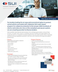 For lenders looking for an easy and economical option to protect varied vehicle and watercraft collateral, SUI’s web-based program for collateral protection is the answer. With hundreds of clients nationally who rely on this compliant and secure system, we are a leading provider to diverse auto lenders.